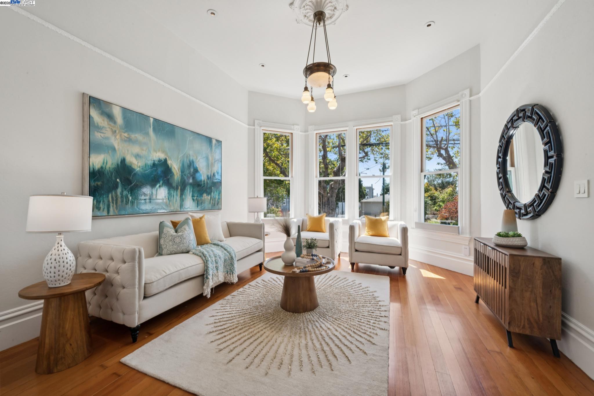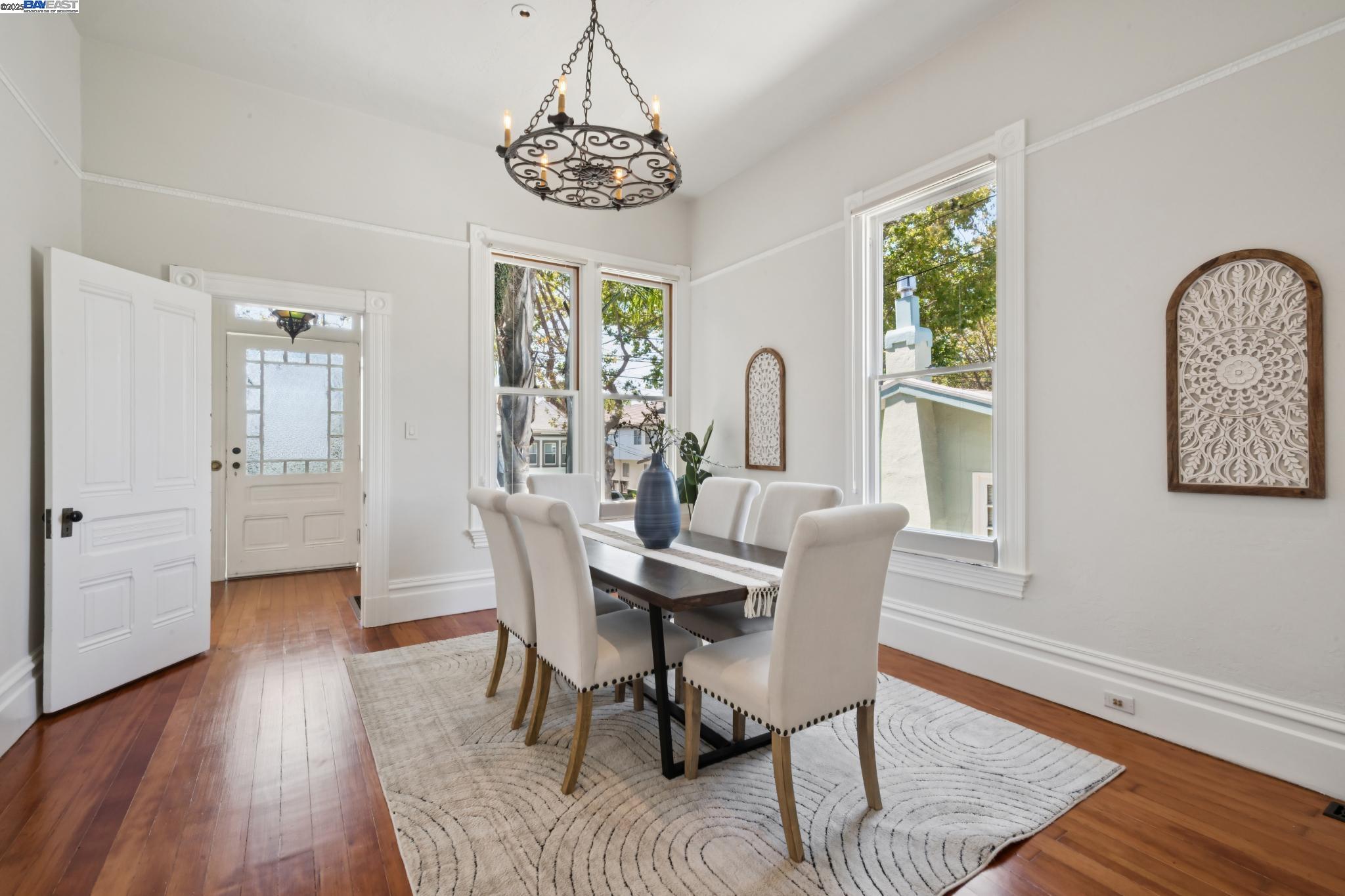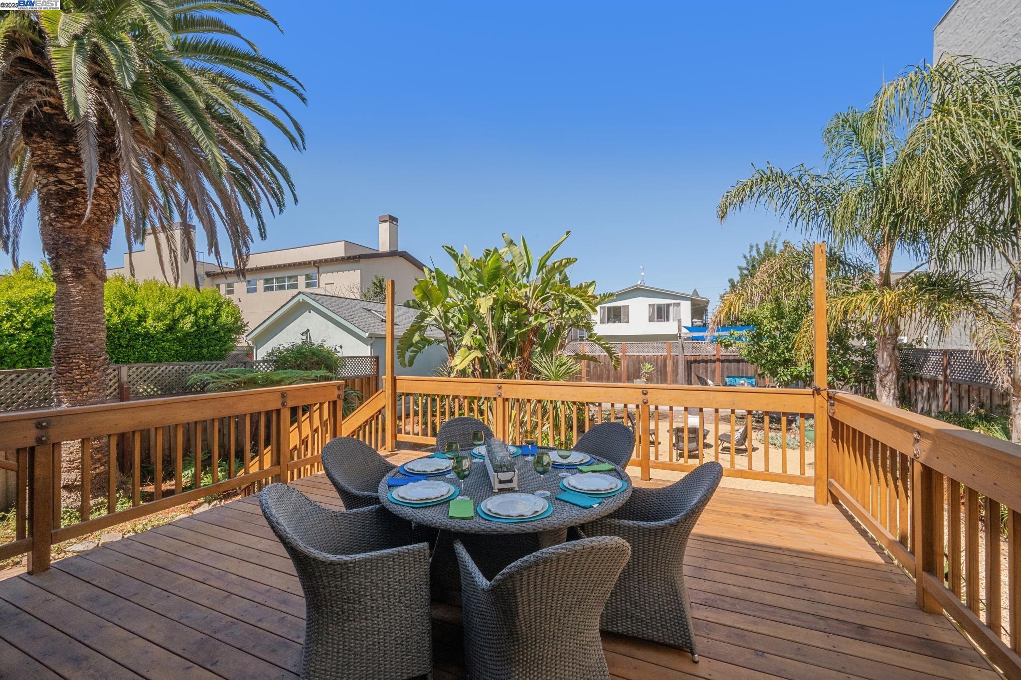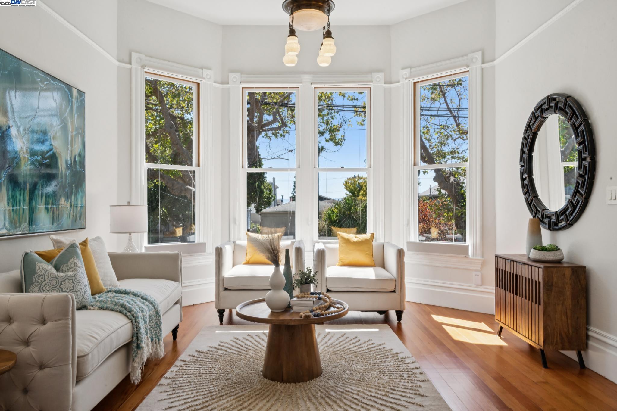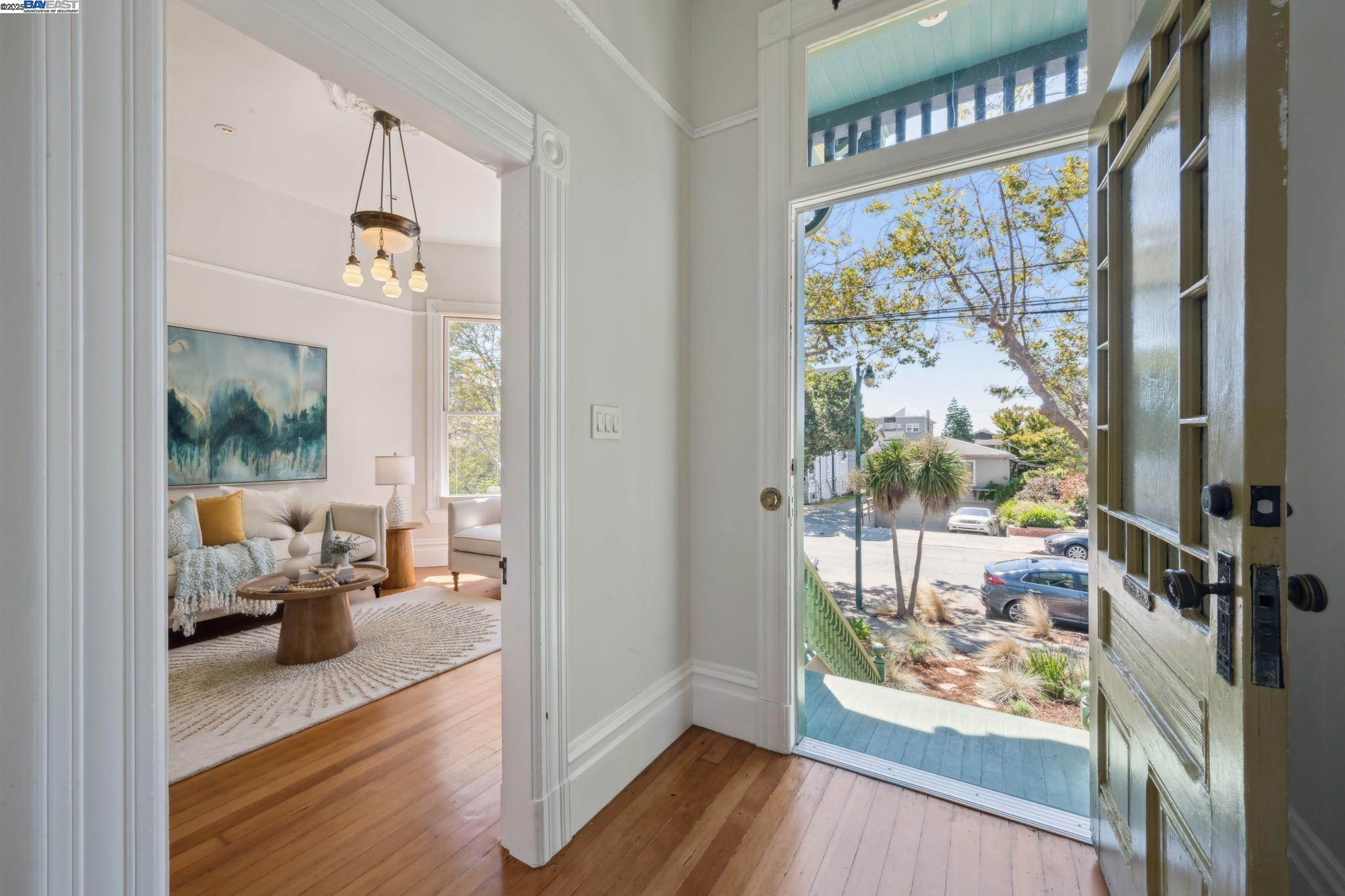 Welcome to your exquisite 1895 Victorian in Alameda's prestigious Bronze Coast. This elegant home combines historic charm with modern sophistication, ideal for single or multi-generational living. Spanning 3,316 square feet, it offers five well-appointed bedrooms: three on the upper levels with a bath, kitchen, dining, and living room, plus two on the ground floor with their own spaces. Each level is linked by an elegant wood staircase and has private entrances. Inside, refined craftsmanship shines with a blend of hardwood and concrete floors. The renovated ground-level kitchen, bath, and bedrooms offer contemporary flair while preserving the home's original allure. Sunlight cascades through floor-to-ceiling windows, enhancing the ambiance created by chandeliers and recessed lighting. Storage is plentiful with a spacious walk-in closet and an expansive attic with architectural plans for future expansion. Outside, enjoy a lush tropical oasis with landscaped gardens, a large deck for dining, and serene patio spaces. Smart irrigation and a fenced perimeter ensure privacy and ease of maintenance. Ideally located with enviable walk and bike scores, and near Downtown Alameda, scenic beaches, shopping, and top schools. Experience unparalleled Island comfort and sophistication!