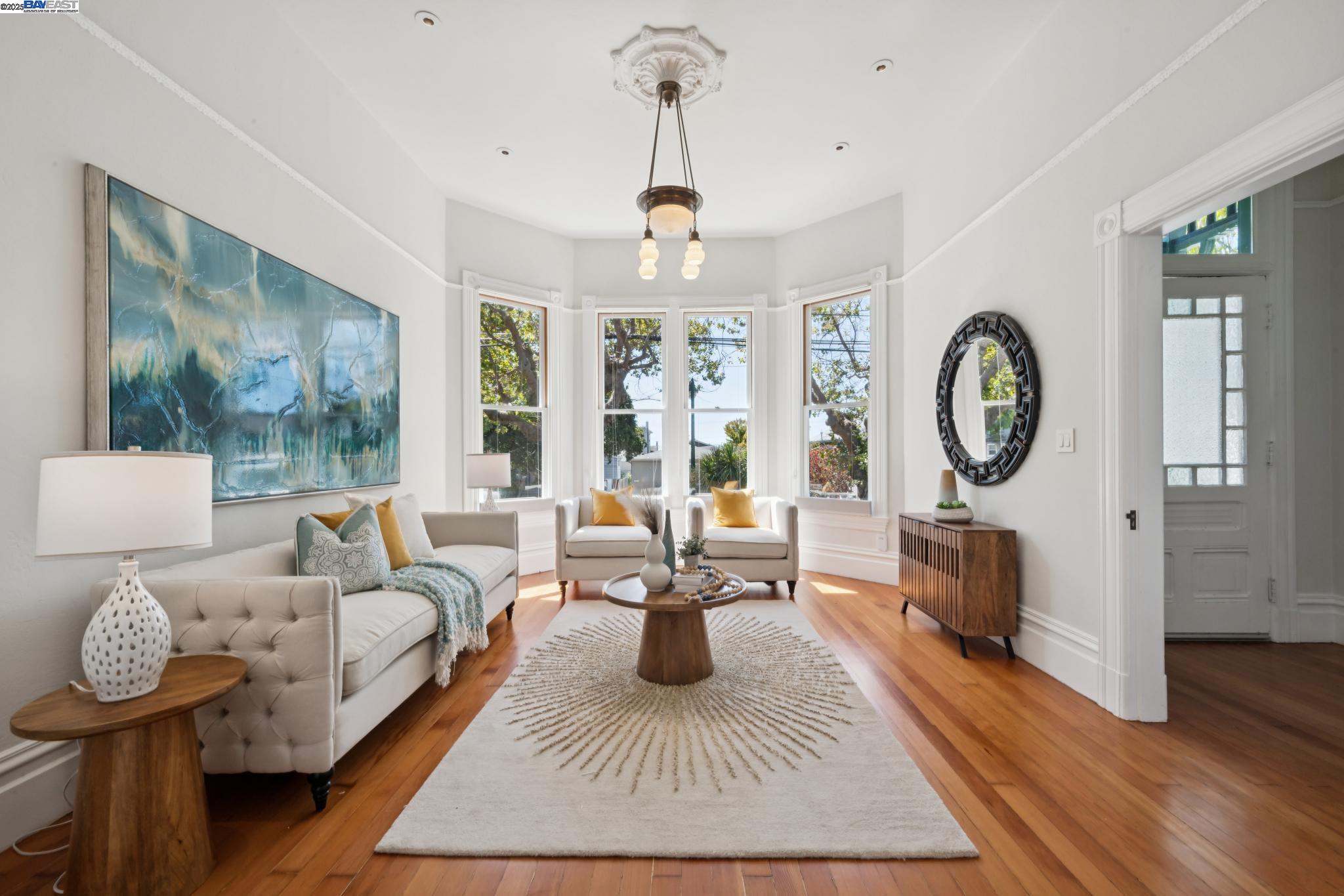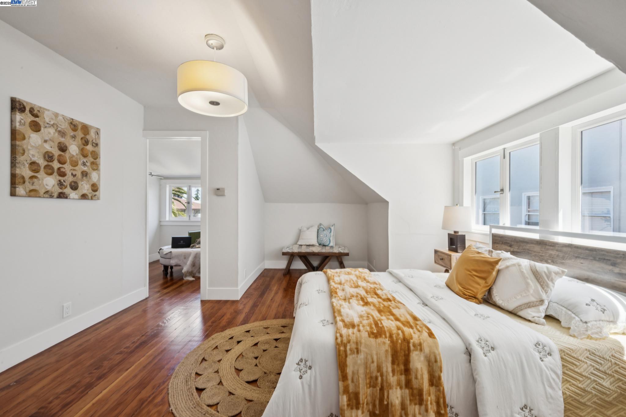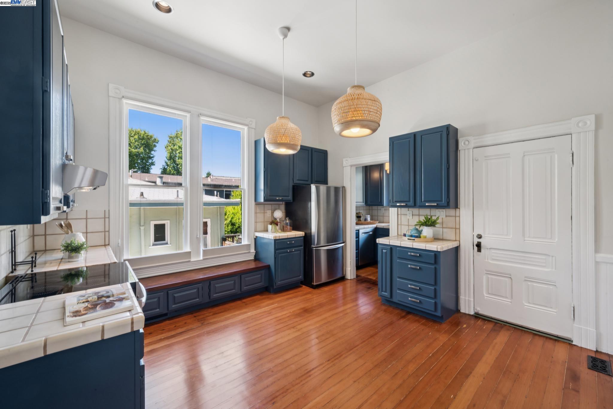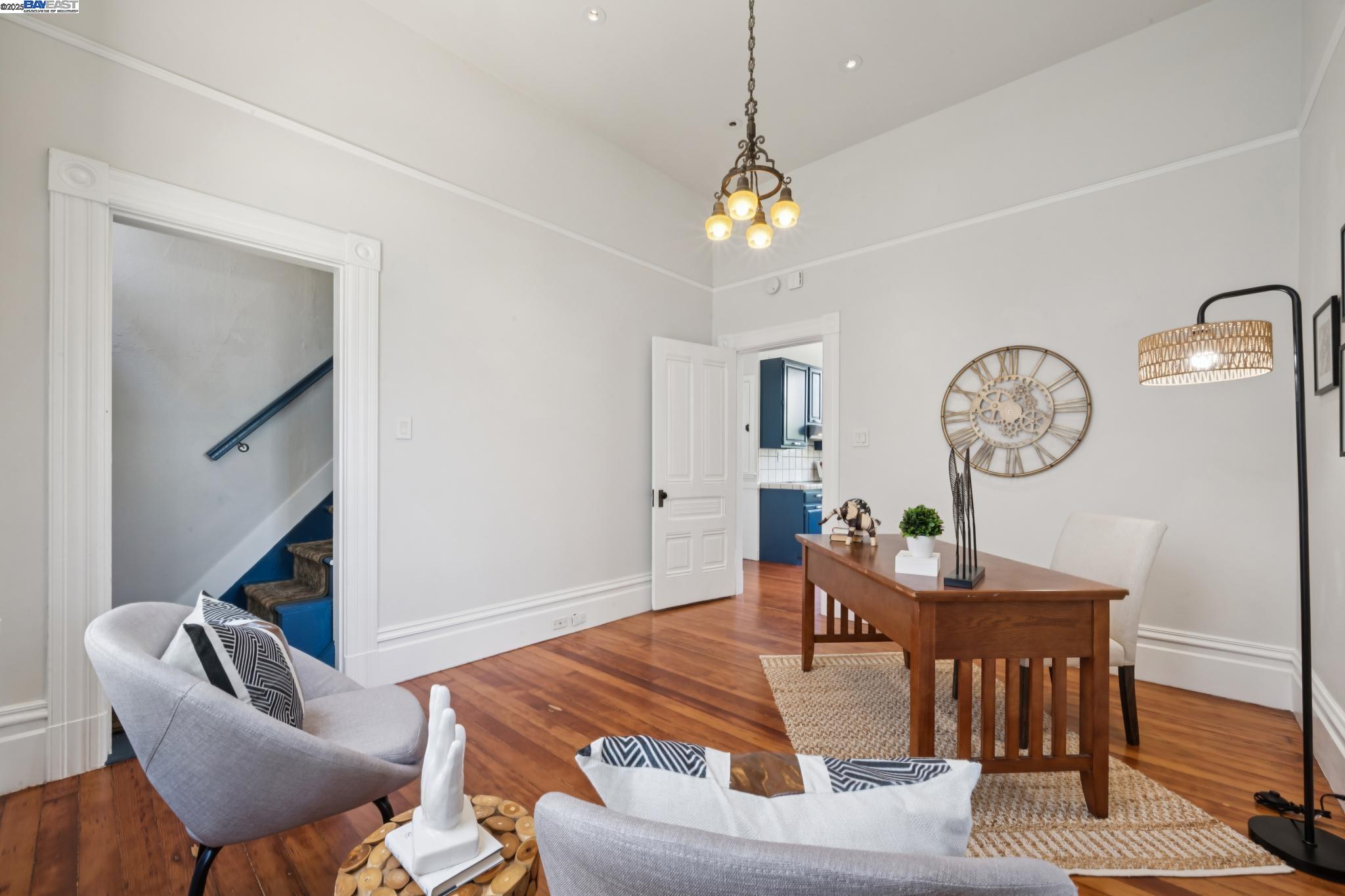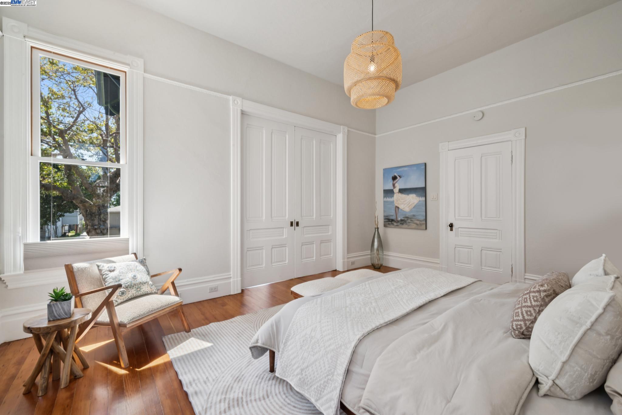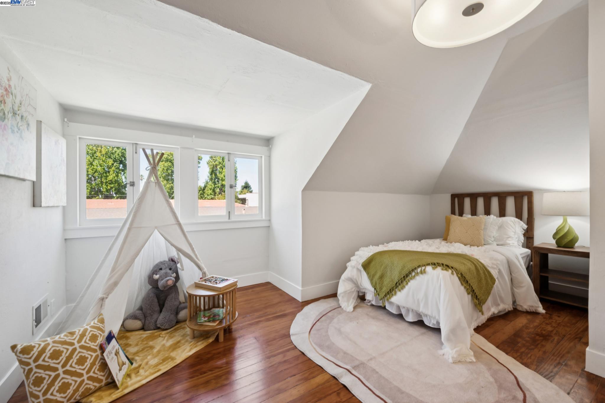 Welcome to your exquisite 1895 Victorian in Alameda's prestigious Bronze Coast. This elegant home combines historic charm with modern sophistication, ideal for single or multi-generational living. Spanning 3,316 square feet, it offers five well-appointed bedrooms: three on the upper levels with a bath, kitchen, dining, and living room, plus two on the ground floor with their own spaces. Each level is linked by an elegant wood staircase and has private entrances. Inside, refined craftsmanship shines with a blend of hardwood and concrete floors. The renovated ground-level kitchen, bath, and bedrooms offer contemporary flair while preserving the home's original allure. Sunlight cascades through floor-to-ceiling windows, enhancing the ambiance created by chandeliers and recessed lighting. Storage is plentiful with a spacious walk-in closet and an expansive attic with architectural plans for future expansion. Outside, enjoy a lush tropical oasis with landscaped gardens, a large deck for dining, and serene patio spaces. Smart irrigation and a fenced perimeter ensure privacy and ease of maintenance. Ideally located with enviable walk and bike scores, and near Downtown Alameda, scenic beaches, shopping, and top schools. Experience unparalleled Island comfort and sophistication!