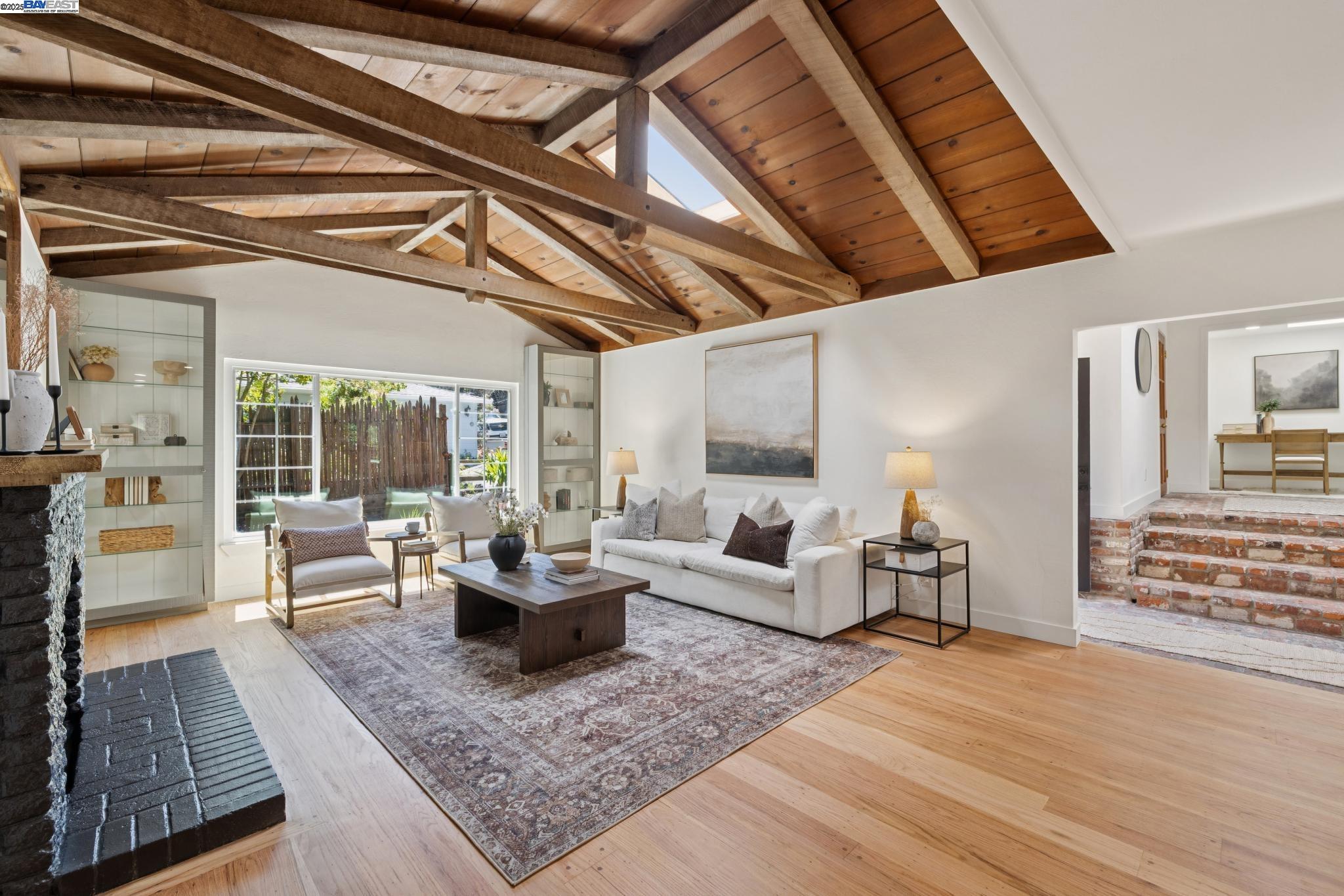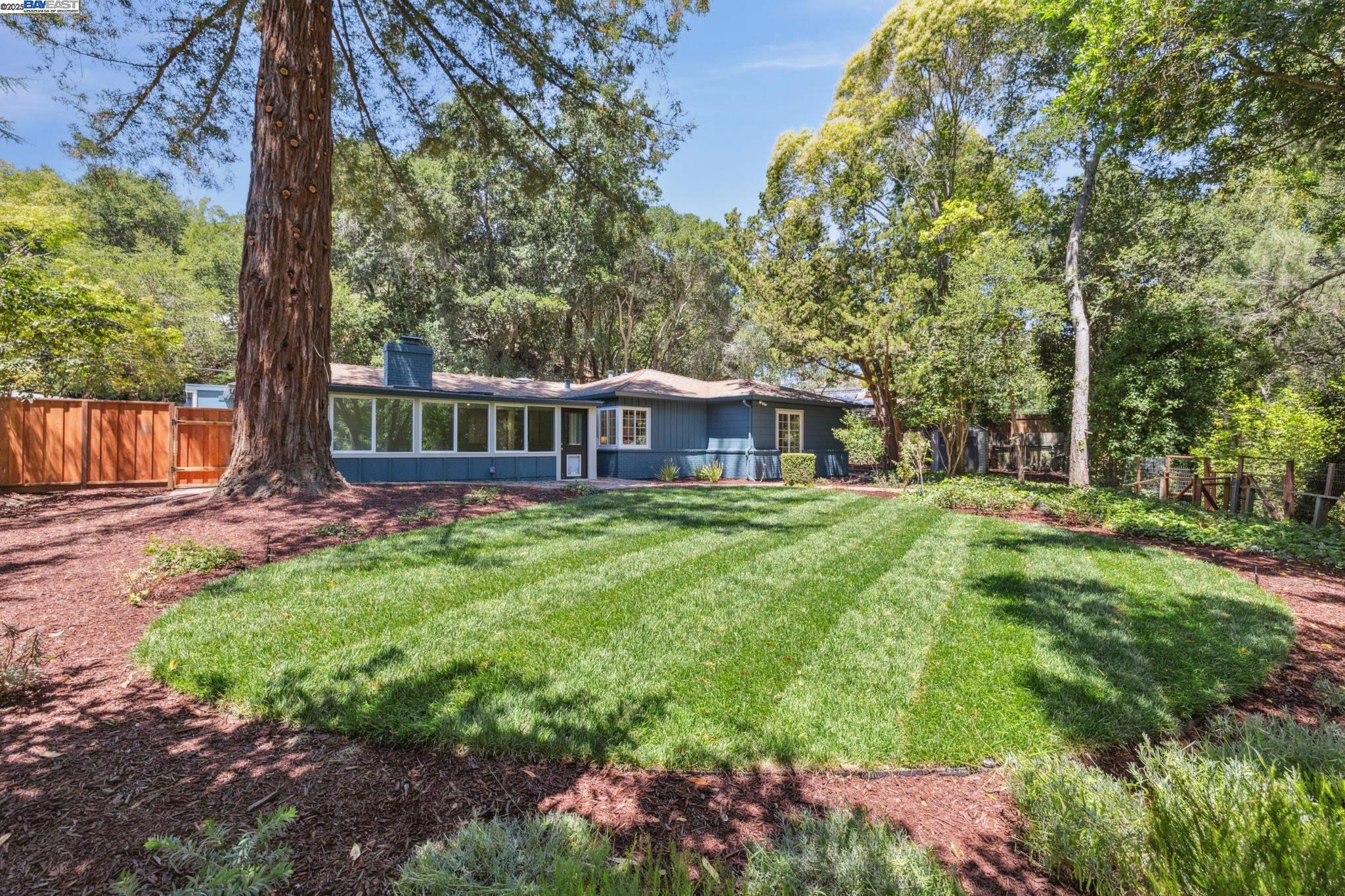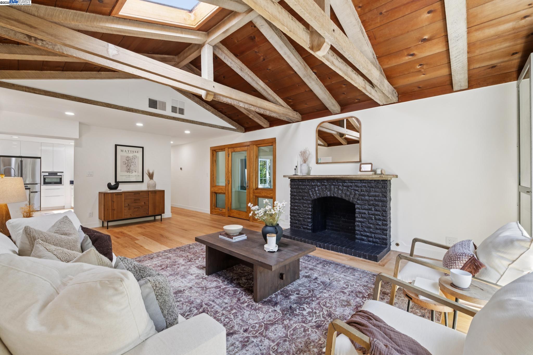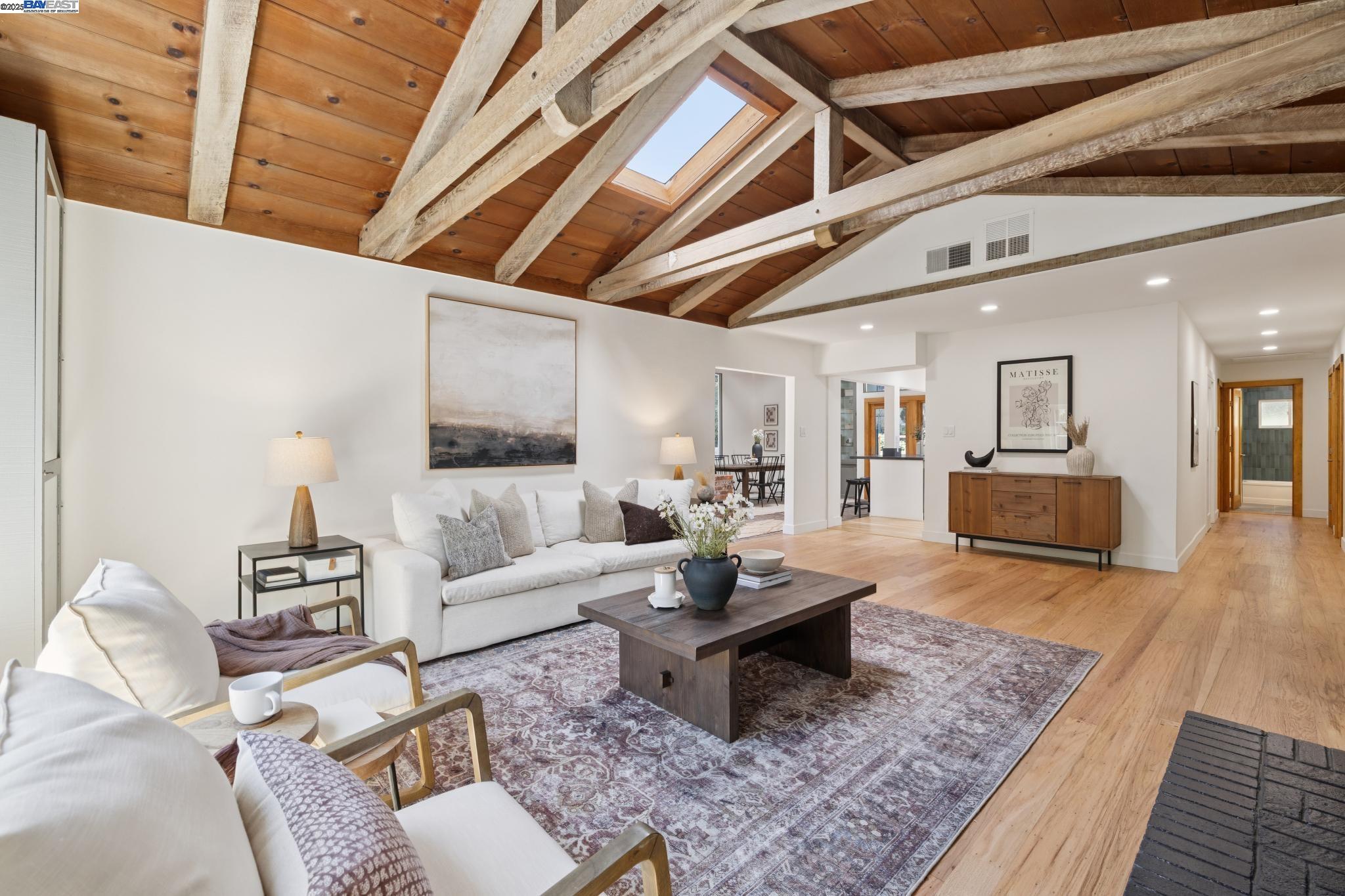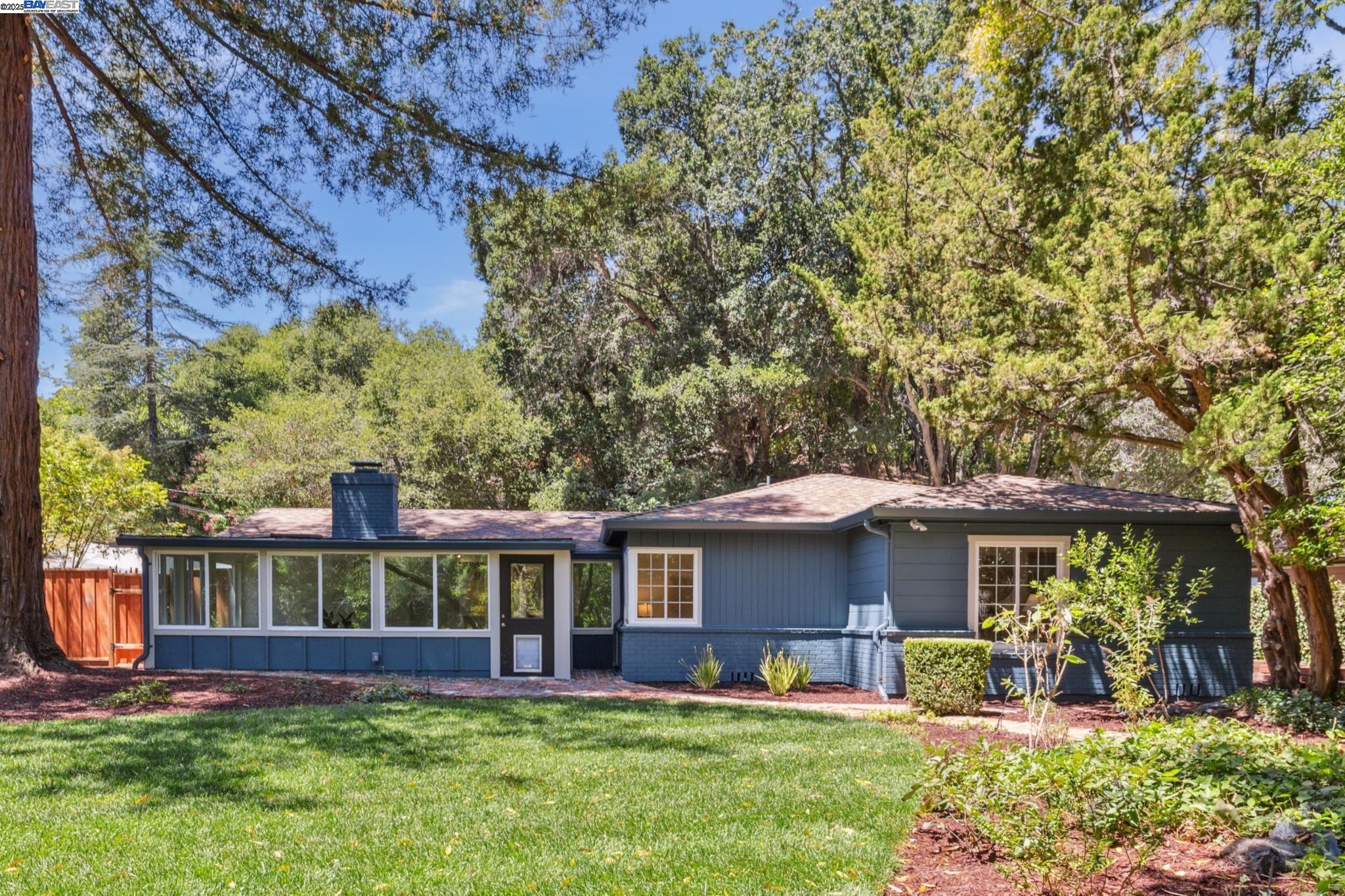 Tucked away on a private cul-de-sac, this beautifully refreshed mid-century gem offers timeless character, modern updates, and extraordinary land. Inside, you'll find a thoughtfully updated kitchen and refreshed bathrooms, along with refinished hardwood floors and fresh interior/exterior paint that enhance the home's clean, classic aesthetic. The regal great room steals the show with vaulted ceilings, exposed beams, and generous natural light--perfect for entertaining. The flexible floor plan includes 4 bedrooms, 2 bathrooms, an office nook, and an enclosed sunroom, offering space for every lifestyle. Step outside to your own private haven: a sun-drenched deck with new handrails, serene backyard, raised garden beds, and a storage shed, all framed by lush natural surroundings. Set on a sprawling 0.77-acre lot, the property features a private bridge over a tranquil creek, leading to an additional carport and second access from Moraga Way. Whether hosting or unwinding, this home offers an ideal indoor-outdoor experience. Additional highlights include a 1-car garage, proximity to top-rated Orinda schools, and a peaceful setting that feels miles away--yet moments from everything.
