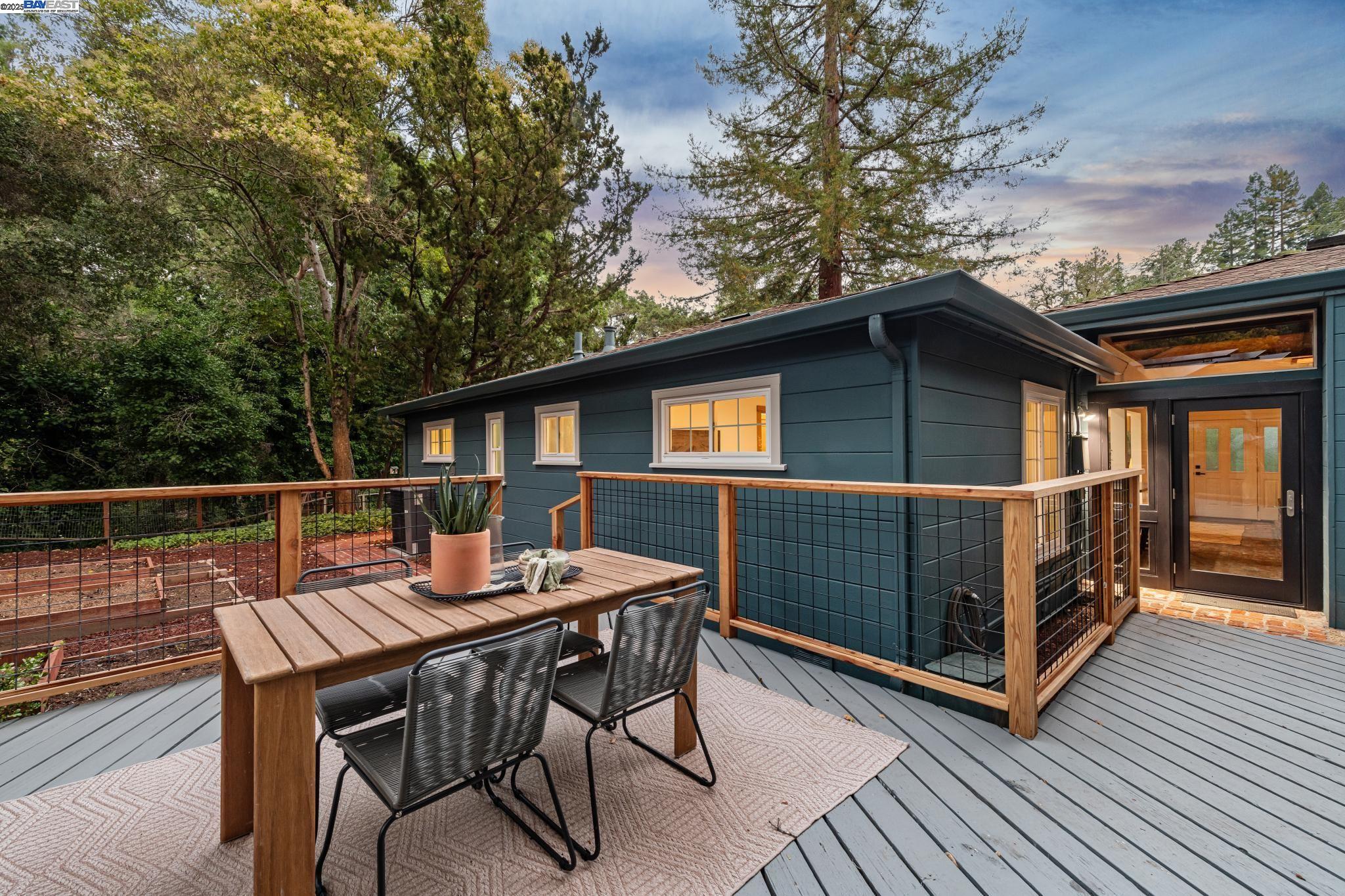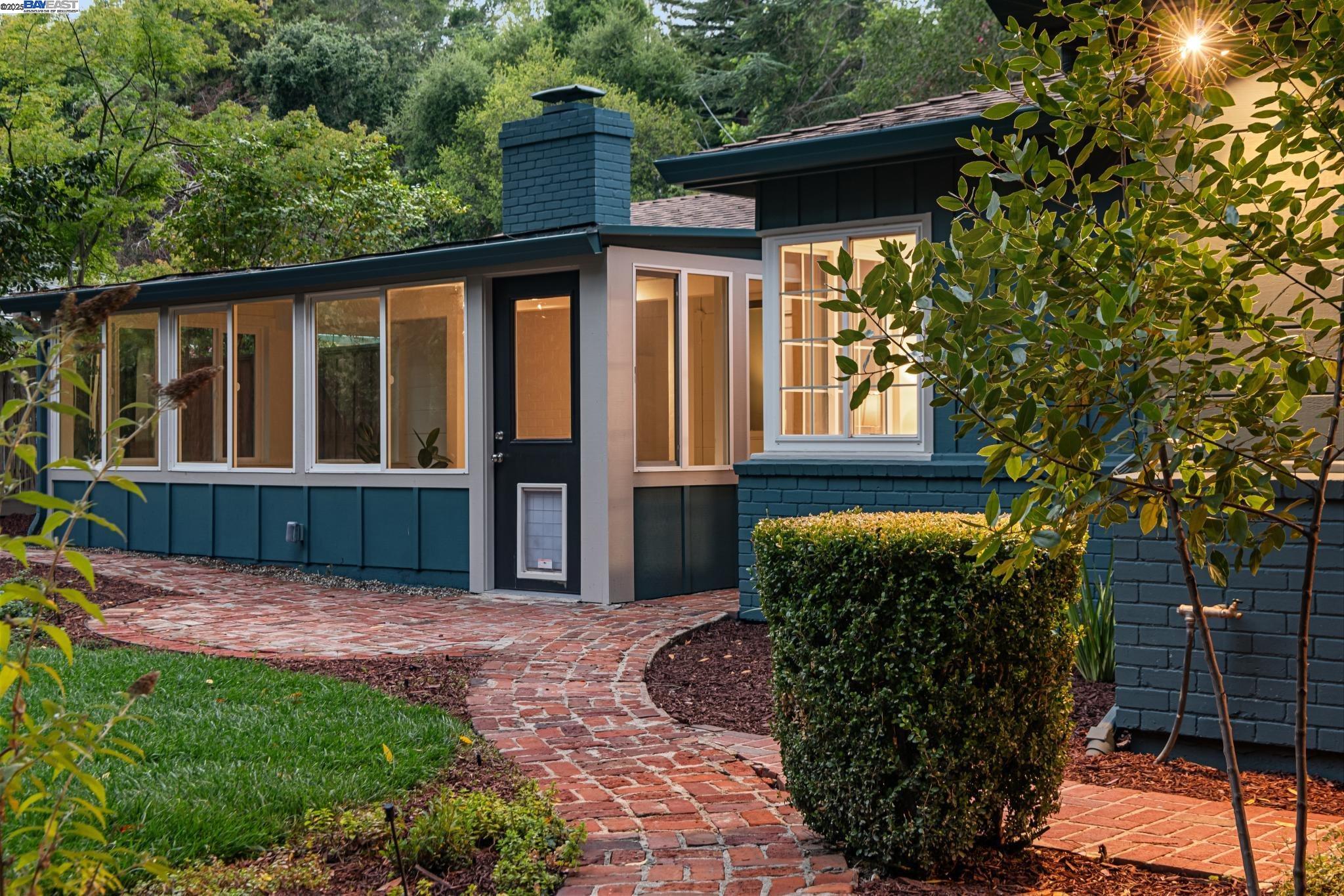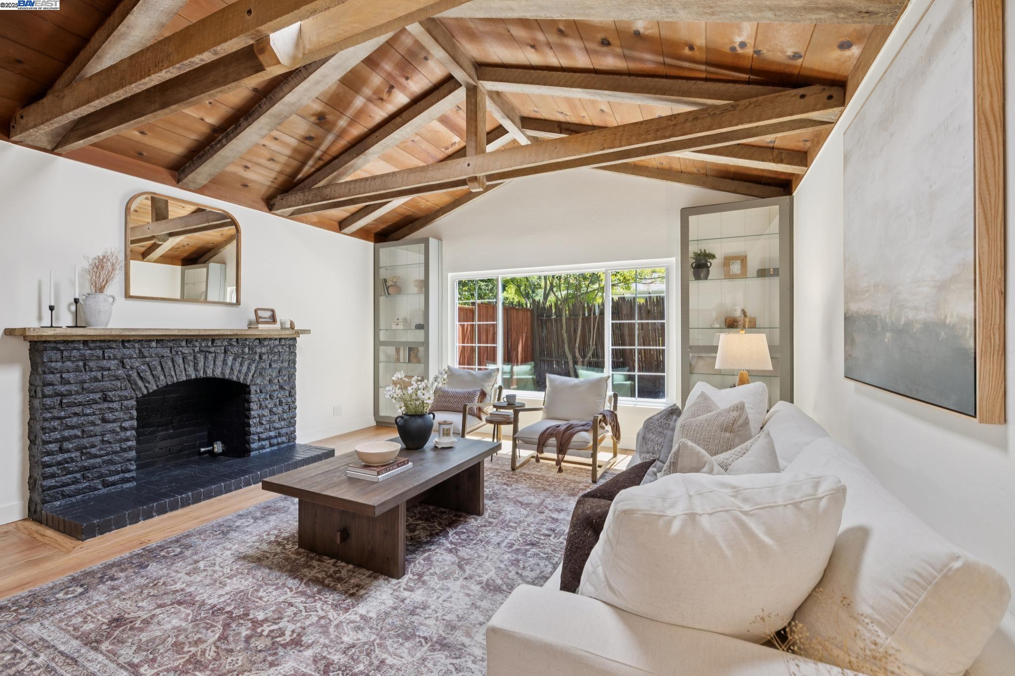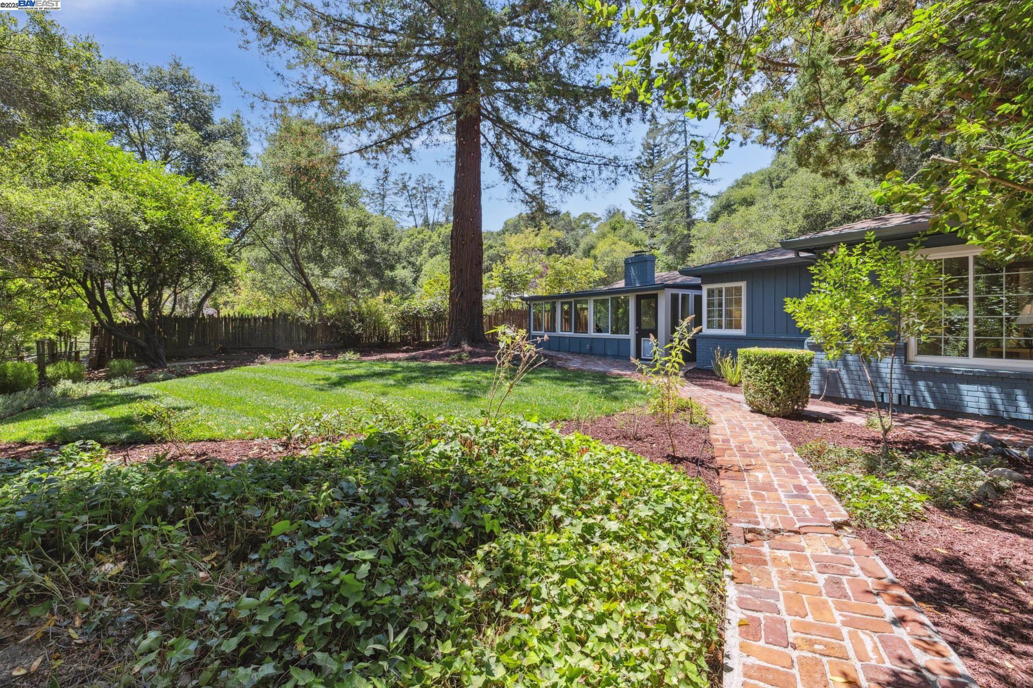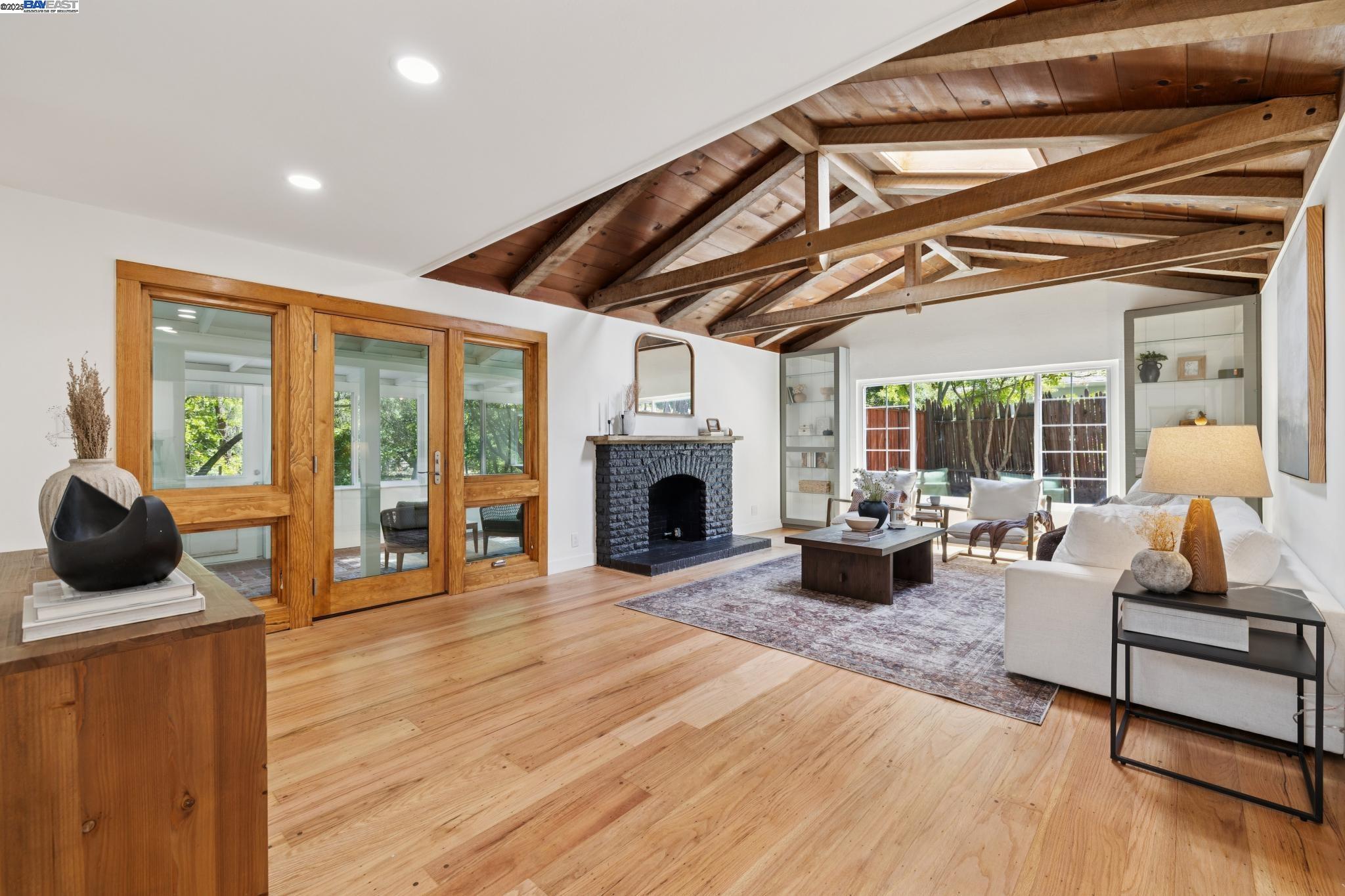 Tucked away on a private cul-de-sac, this beautifully refreshed mid-century gem offers timeless character, modern updates, and extraordinary land. Inside, you'll find a thoughtfully updated kitchen and refreshed bathrooms, along with refinished hardwood floors and fresh interior/exterior paint that enhance the home's clean, classic aesthetic. The regal great room steals the show with vaulted ceilings, exposed beams, and generous natural light--perfect for entertaining. The flexible floor plan includes 4 bedrooms, 2 bathrooms, an office nook, and an enclosed sunroom, offering space for every lifestyle. Step outside to your own private haven: a sun-drenched deck with new handrails, serene backyard, raised garden beds, and a storage shed, all framed by lush natural surroundings. Set on a sprawling 0.77-acre lot, the property features a private bridge over a tranquil creek, leading to an additional carport and second access from Moraga Way. Whether hosting or unwinding, this home offers an ideal indoor-outdoor experience. Additional highlights include a 1-car garage, proximity to top-rated Orinda schools, and a peaceful setting that feels miles away--yet moments from everything.
