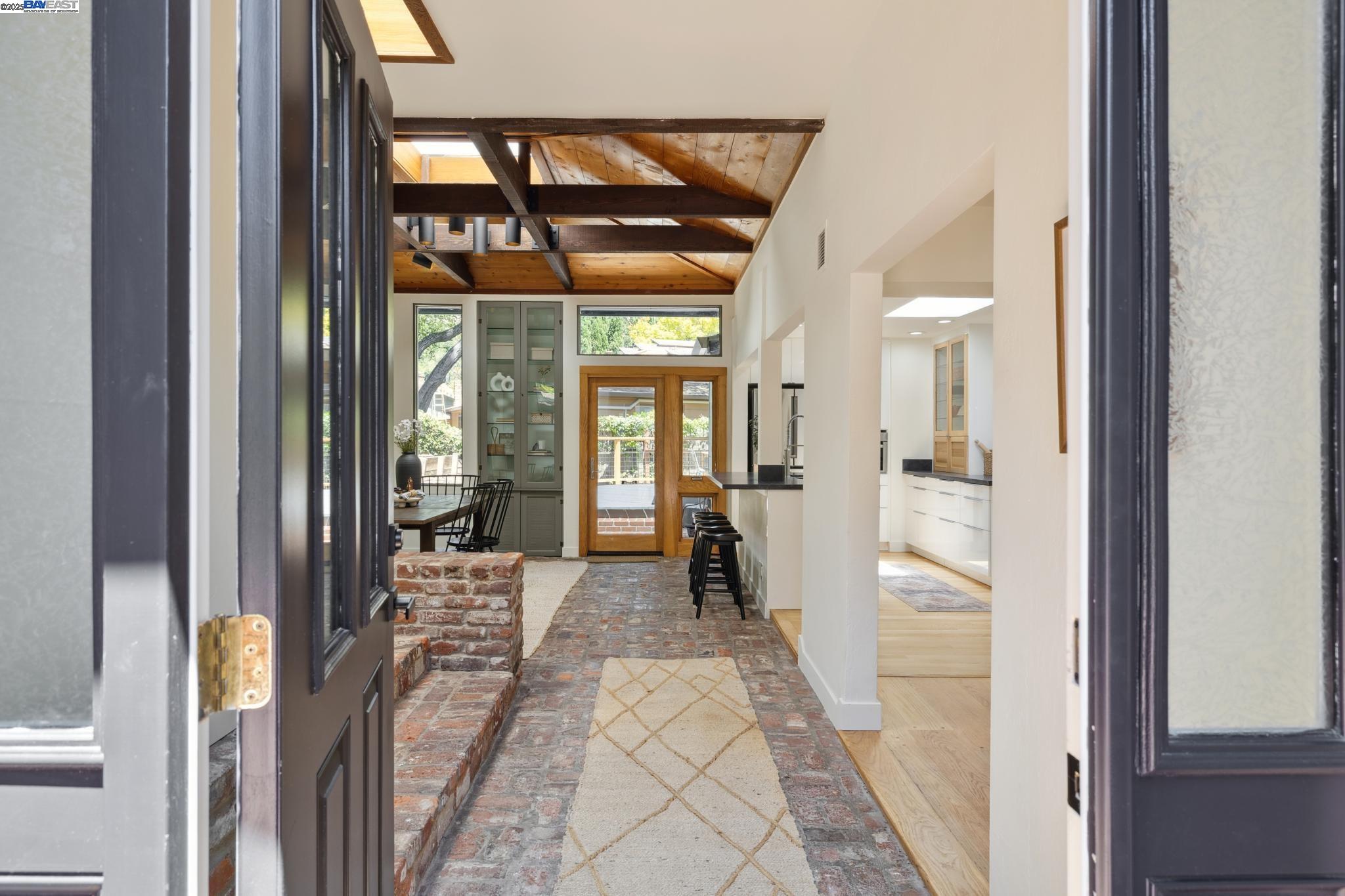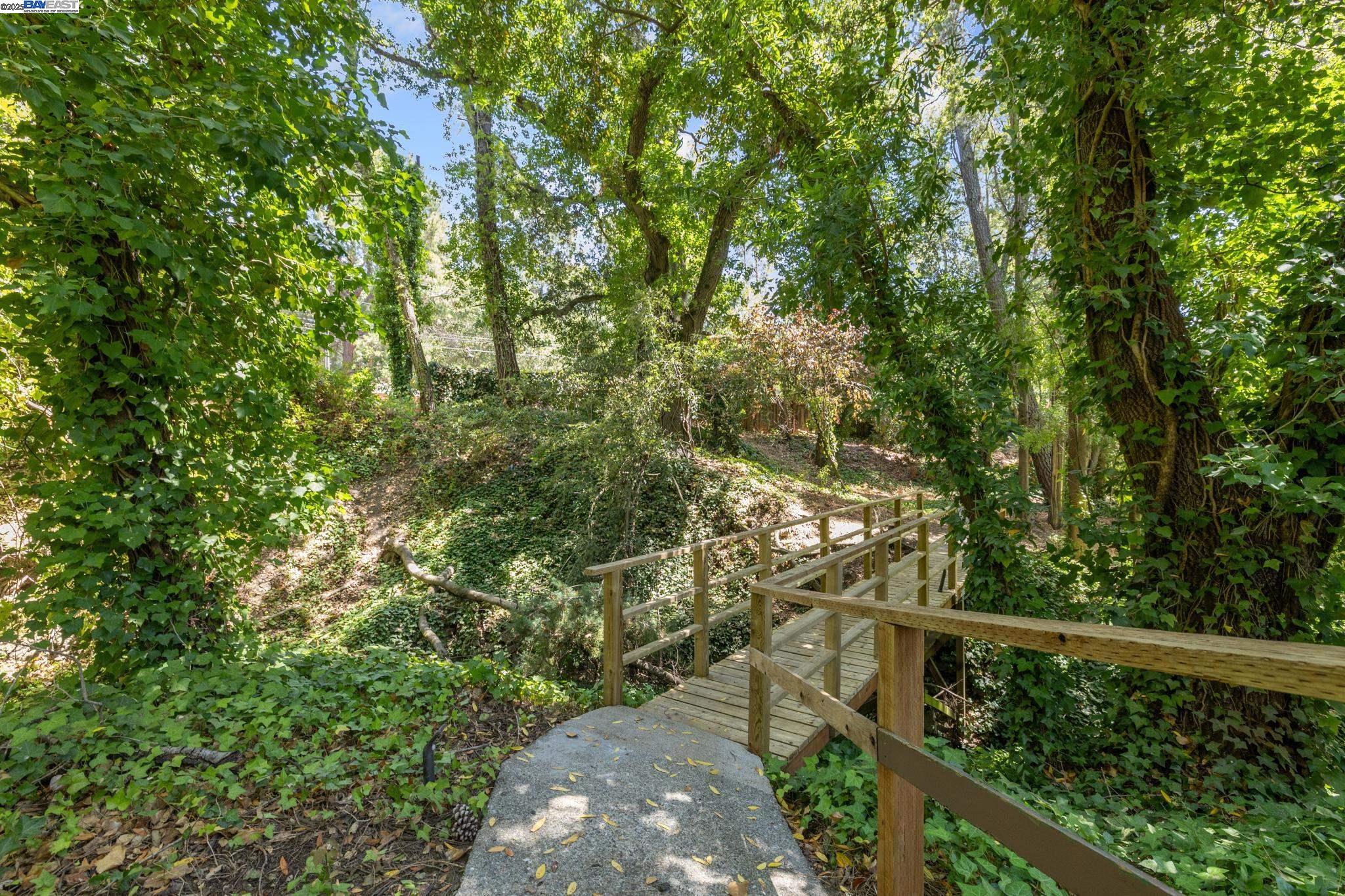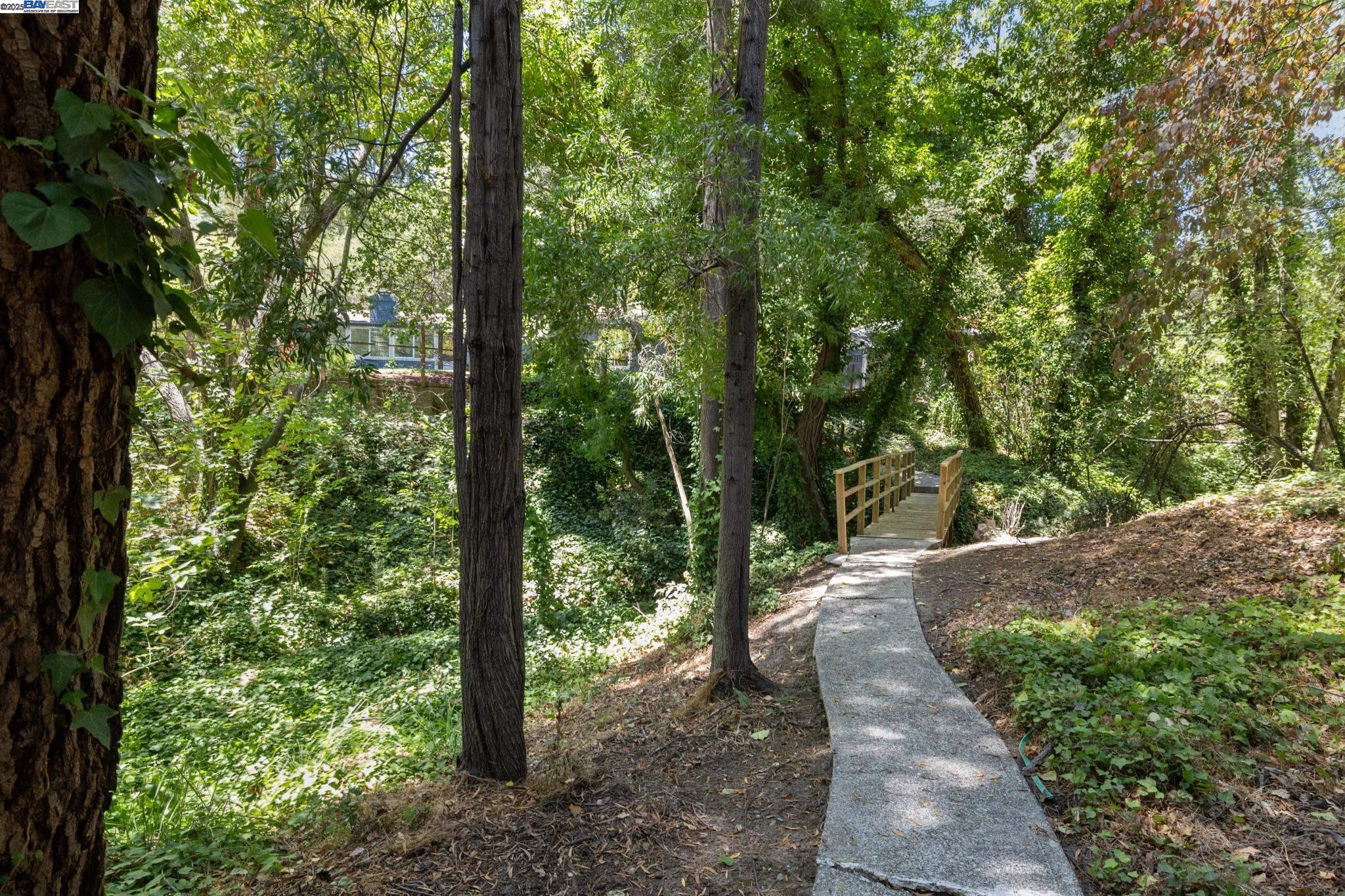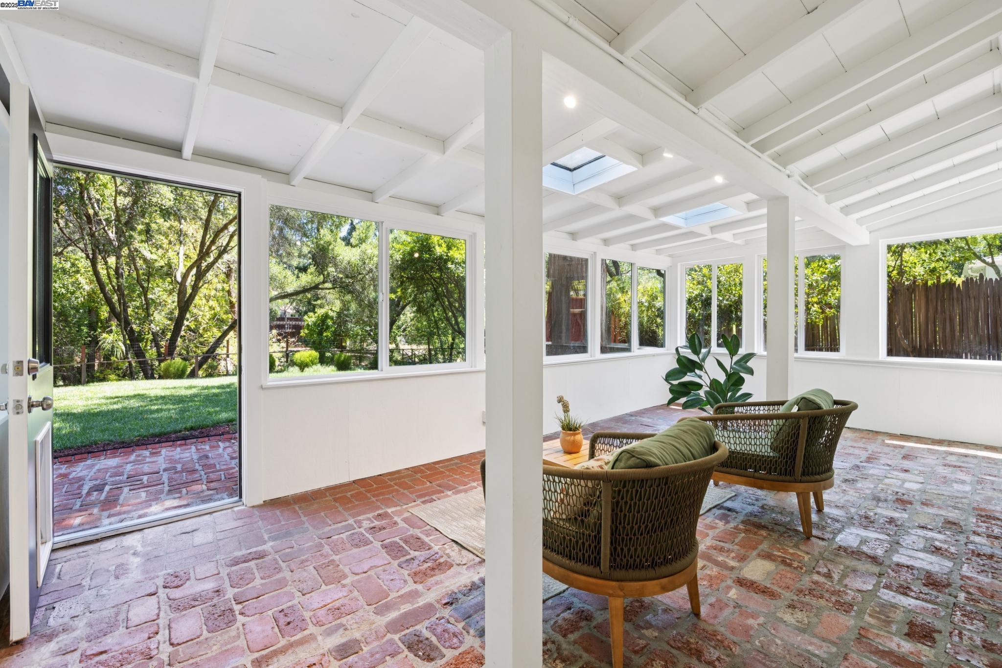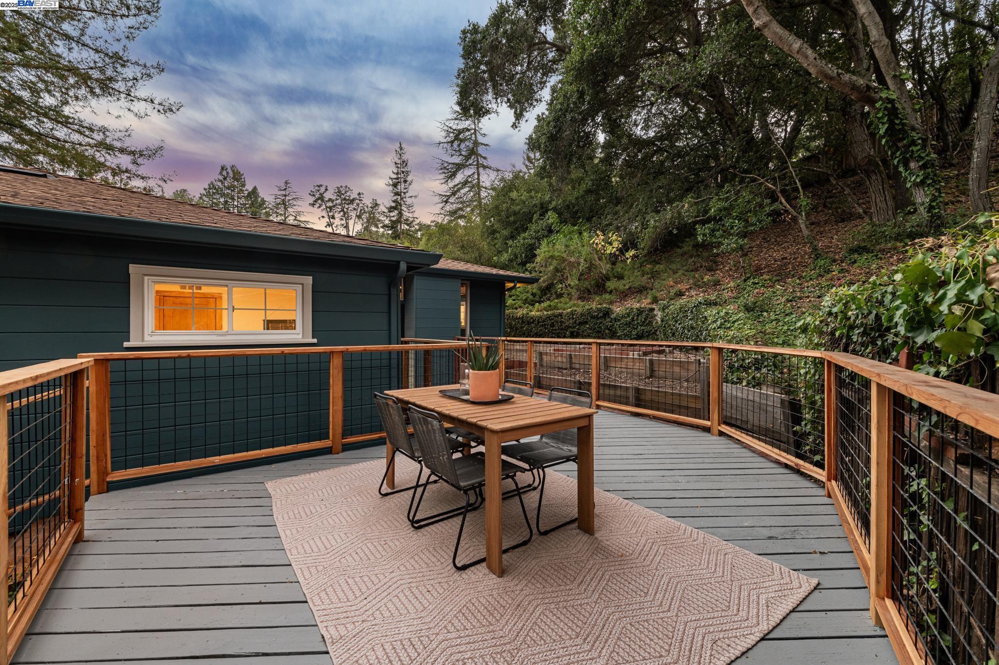 Tucked away on a private cul-de-sac, this beautifully refreshed mid-century gem offers timeless character, modern updates, and extraordinary land. Inside, you'll find a thoughtfully updated kitchen and refreshed bathrooms, along with refinished hardwood floors and fresh interior/exterior paint that enhance the home's clean, classic aesthetic. The regal great room steals the show with vaulted ceilings, exposed beams, and generous natural light--perfect for entertaining. The flexible floor plan includes 4 bedrooms, 2 bathrooms, an office nook, and an enclosed sunroom, offering space for every lifestyle. Step outside to your own private haven: a sun-drenched deck with new handrails, serene backyard, raised garden beds, and a storage shed, all framed by lush natural surroundings. Set on a sprawling 0.77-acre lot, the property features a private bridge over a tranquil creek, leading to an additional carport and second access from Moraga Way. Whether hosting or unwinding, this home offers an ideal indoor-outdoor experience. Additional highlights include a 1-car garage, proximity to top-rated Orinda schools, and a peaceful setting that feels miles away--yet moments from everything.