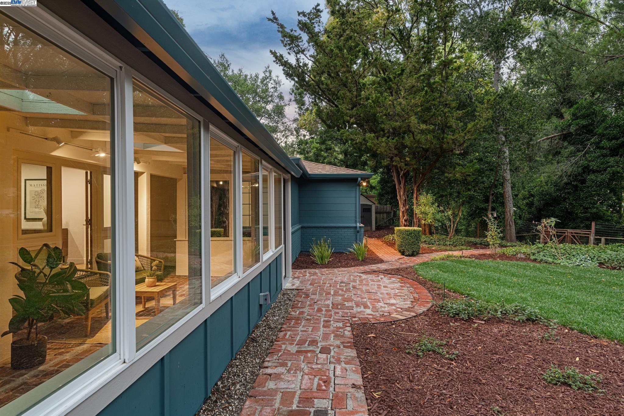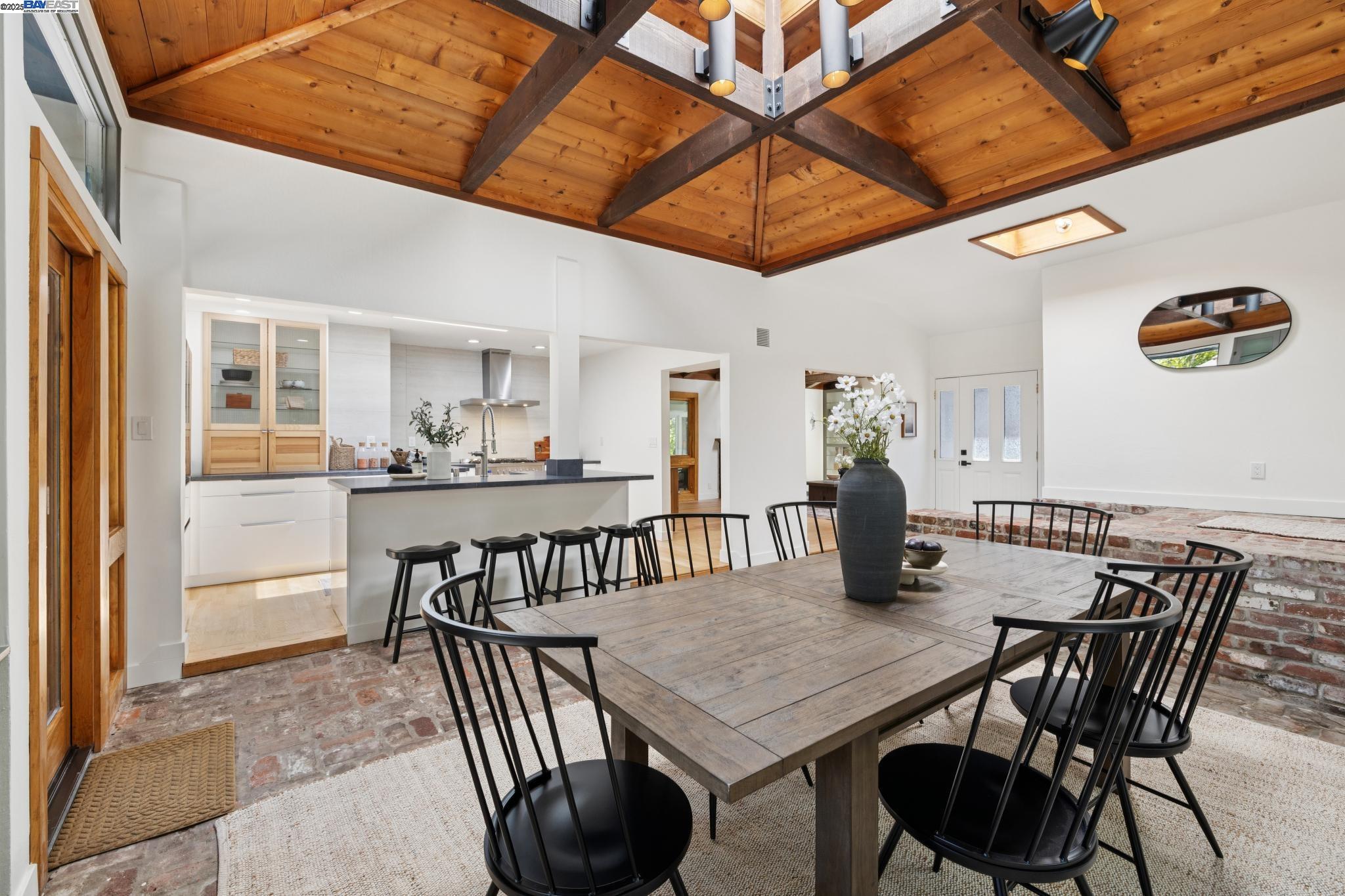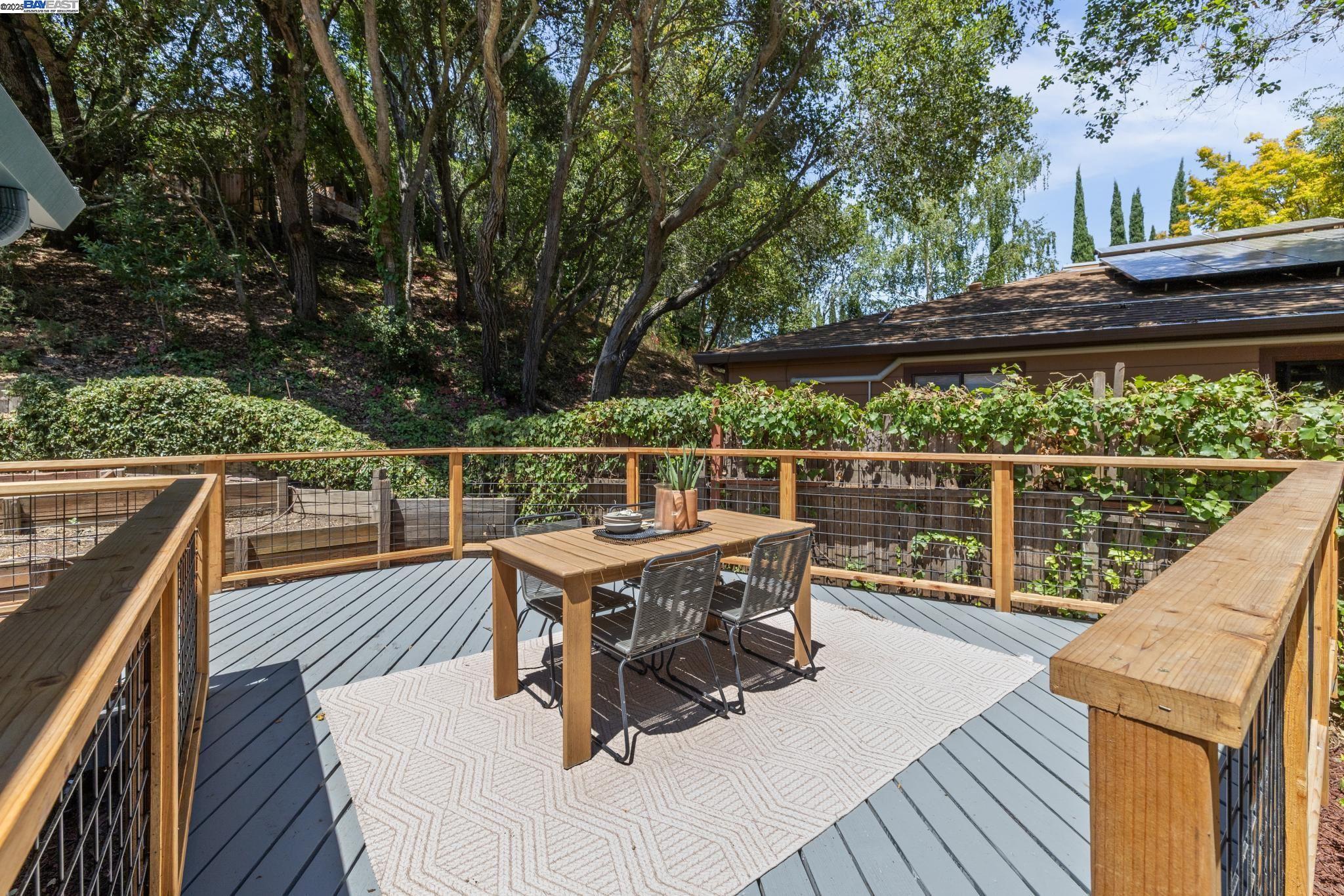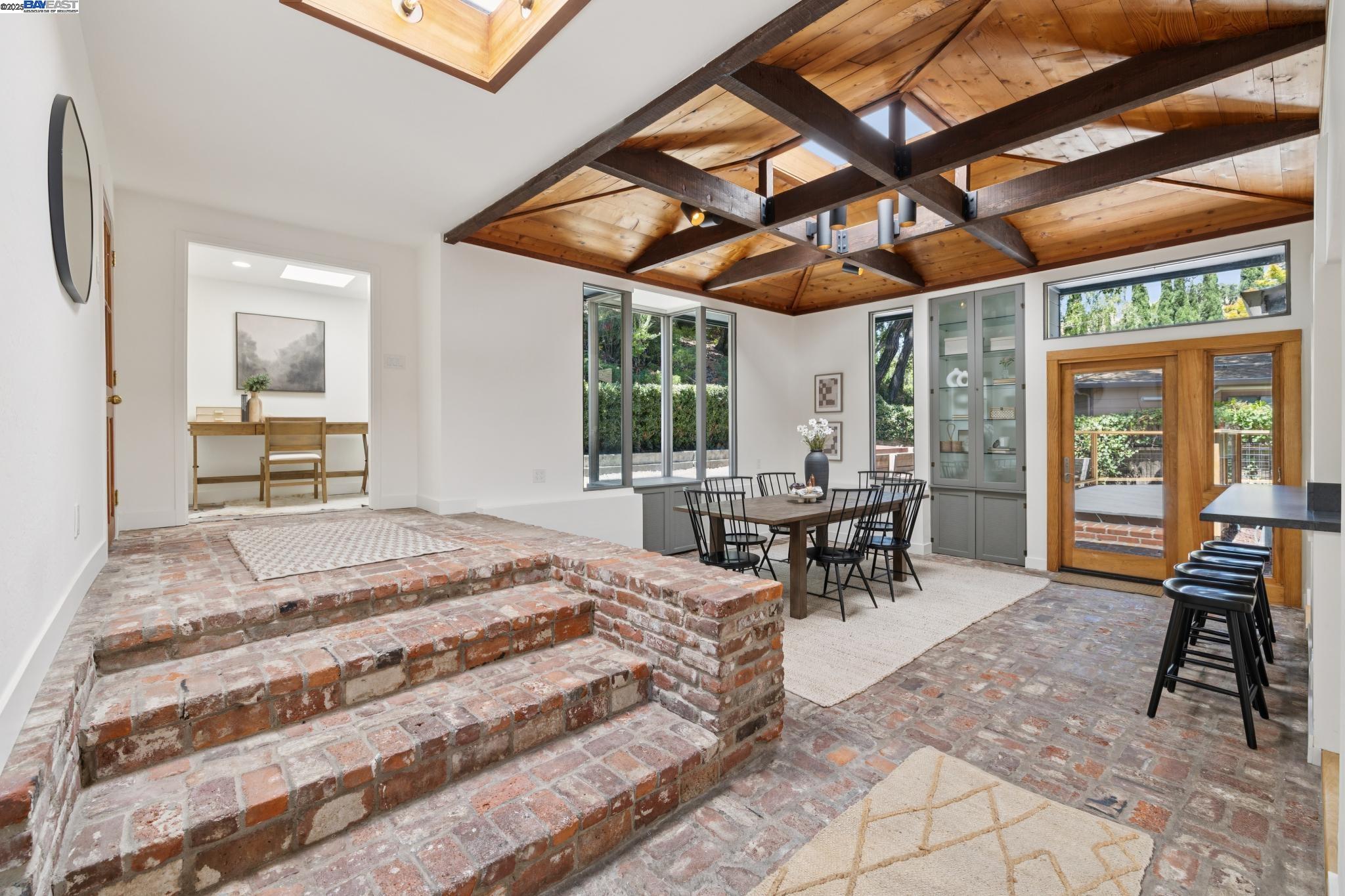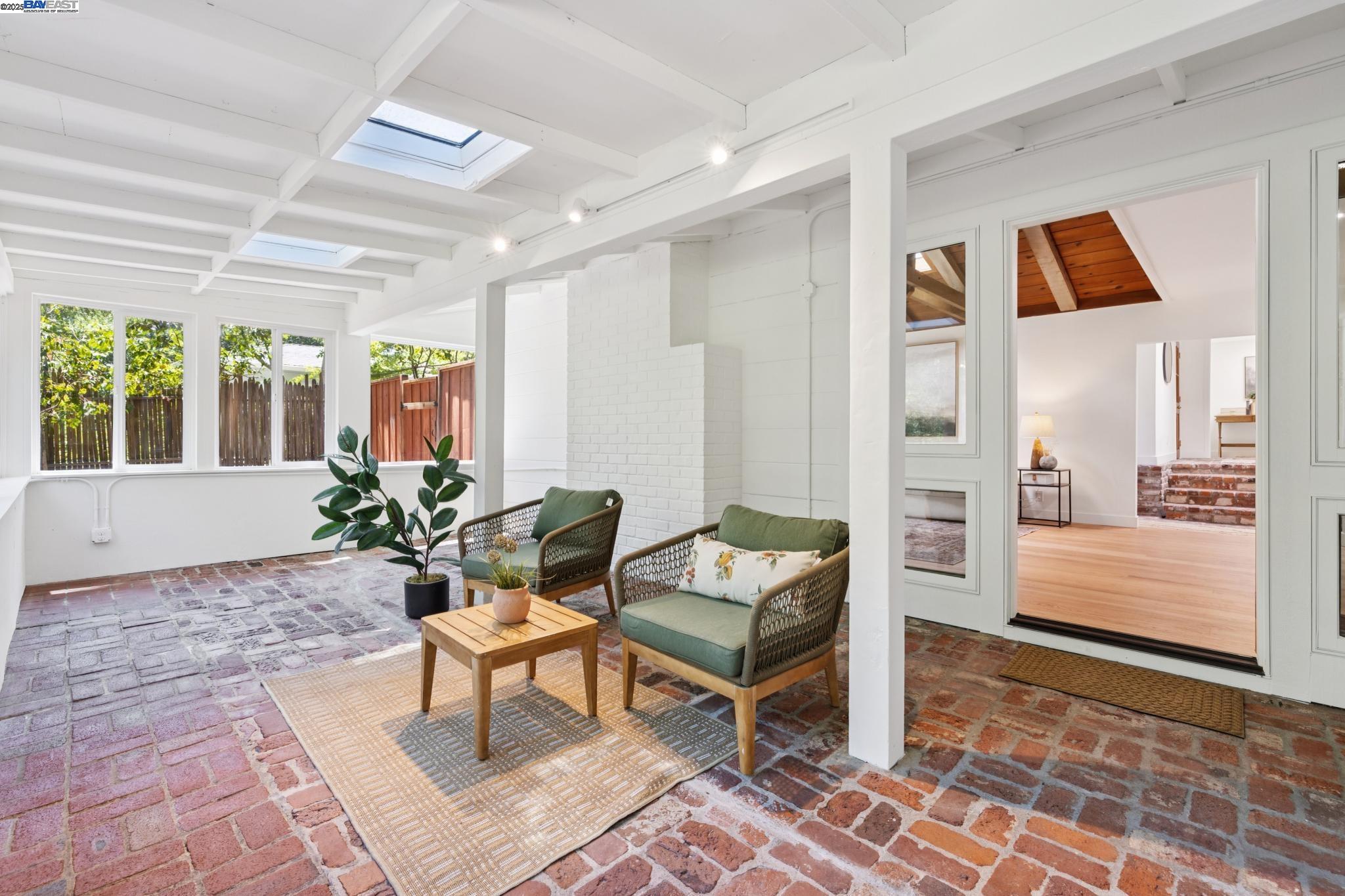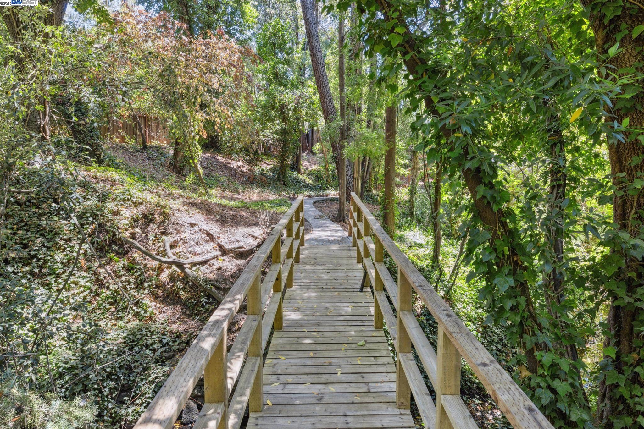 Tucked away on a private cul-de-sac, this beautifully refreshed mid-century gem offers timeless character, modern updates, and extraordinary land. Inside, you'll find a thoughtfully updated kitchen and refreshed bathrooms, along with refinished hardwood floors and fresh interior/exterior paint that enhance the home's clean, classic aesthetic. The regal great room steals the show with vaulted ceilings, exposed beams, and generous natural light--perfect for entertaining. The flexible floor plan includes 4 bedrooms, 2 bathrooms, an office nook, and an enclosed sunroom, offering space for every lifestyle. Step outside to your own private haven: a sun-drenched deck with new handrails, serene backyard, raised garden beds, and a storage shed, all framed by lush natural surroundings. Set on a sprawling 0.77-acre lot, the property features a private bridge over a tranquil creek, leading to an additional carport and second access from Moraga Way. Whether hosting or unwinding, this home offers an ideal indoor-outdoor experience. Additional highlights include a 1-car garage, proximity to top-rated Orinda schools, and a peaceful setting that feels miles away--yet moments from everything.