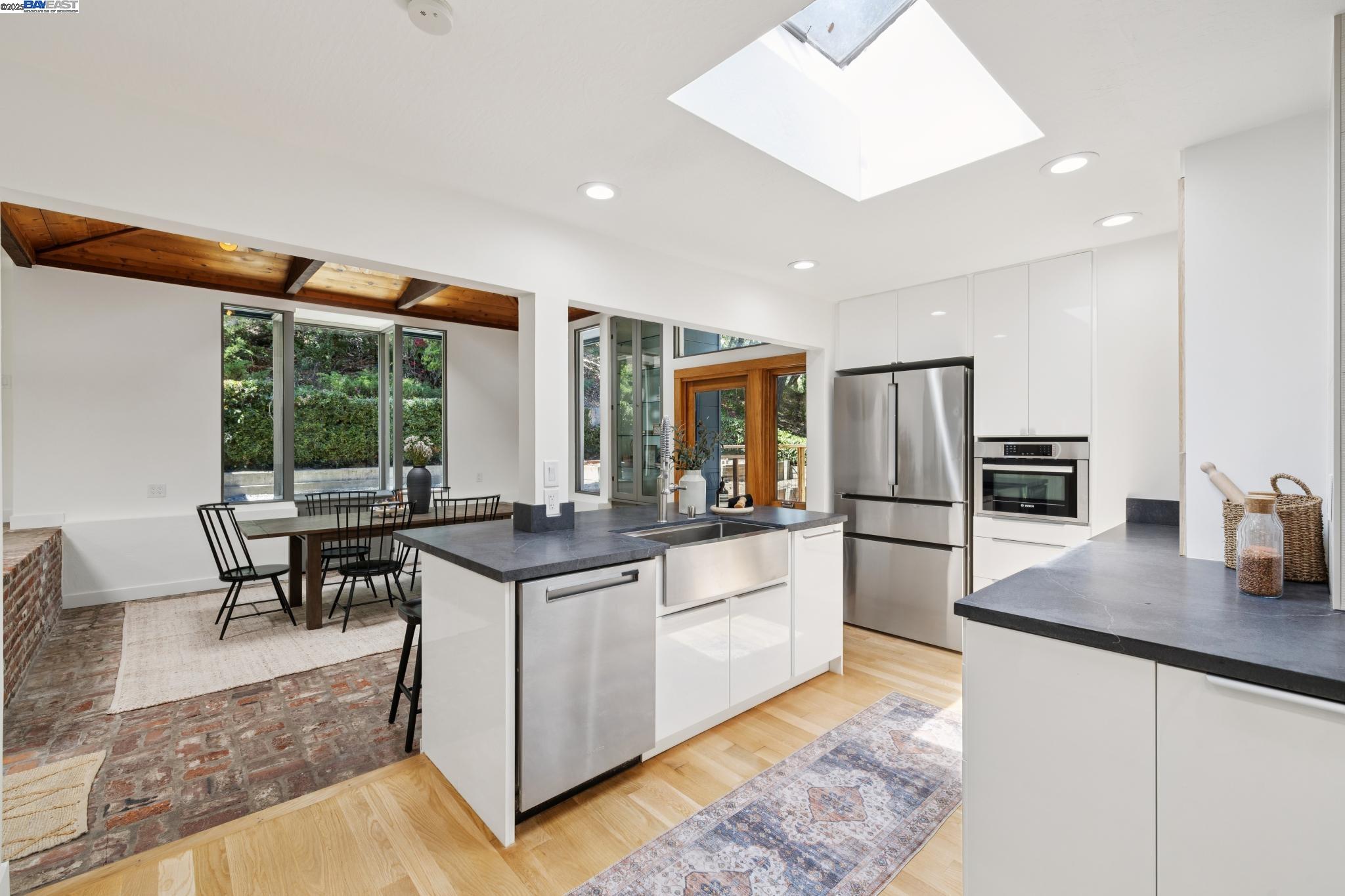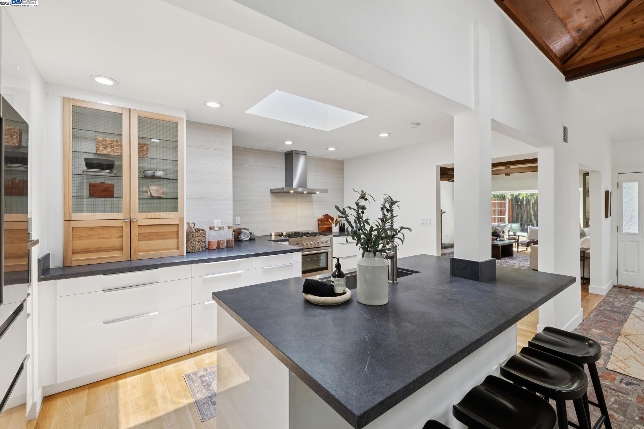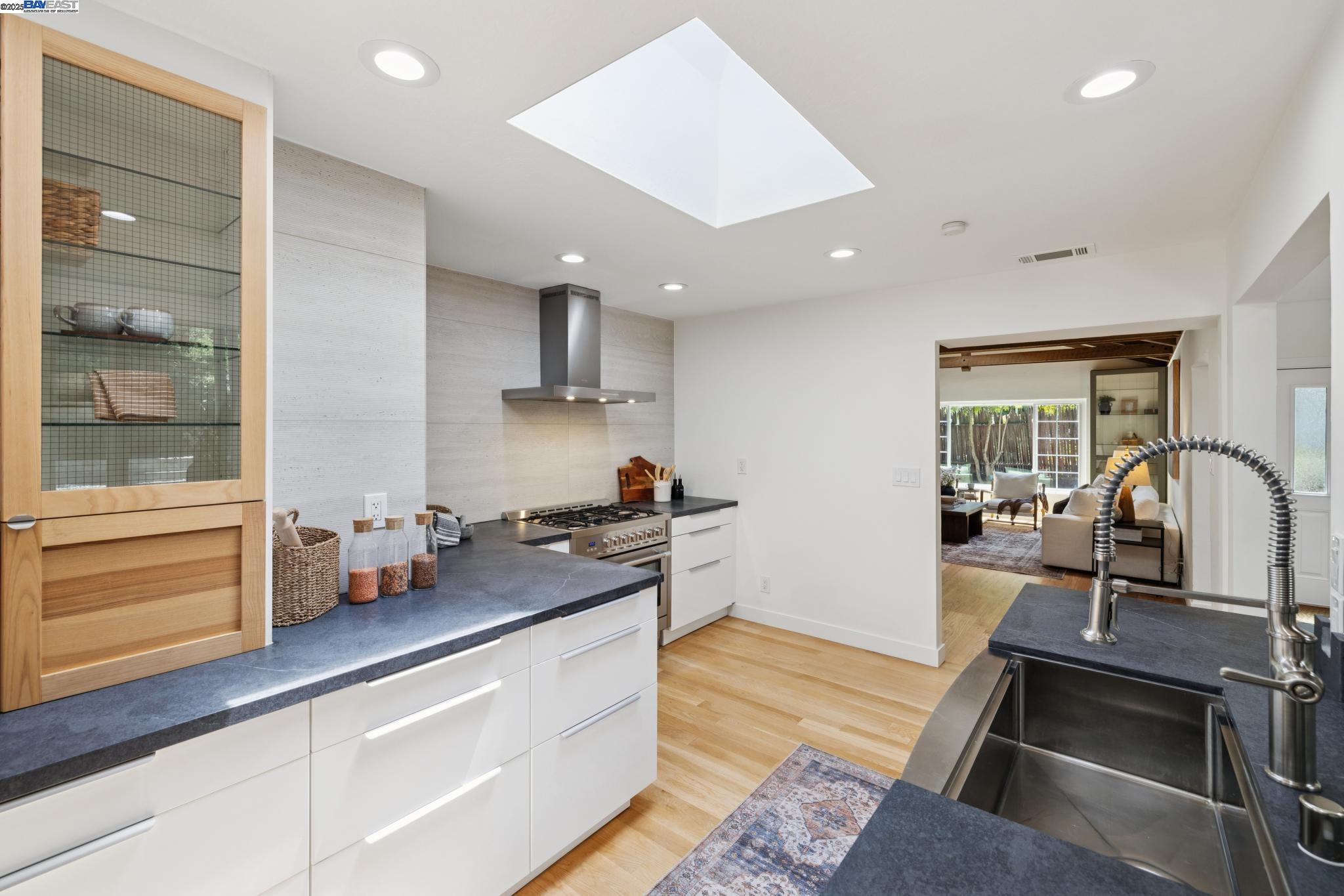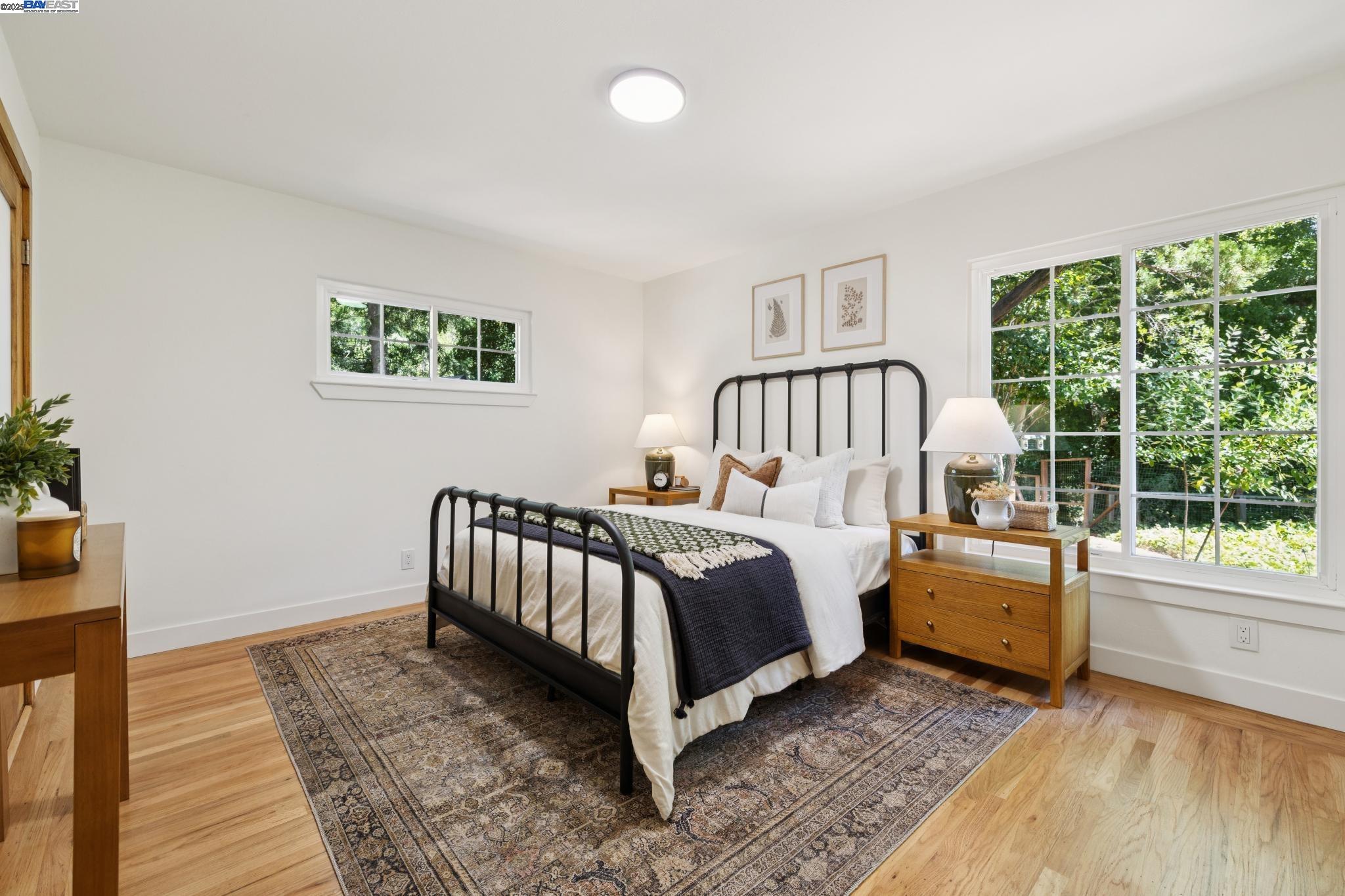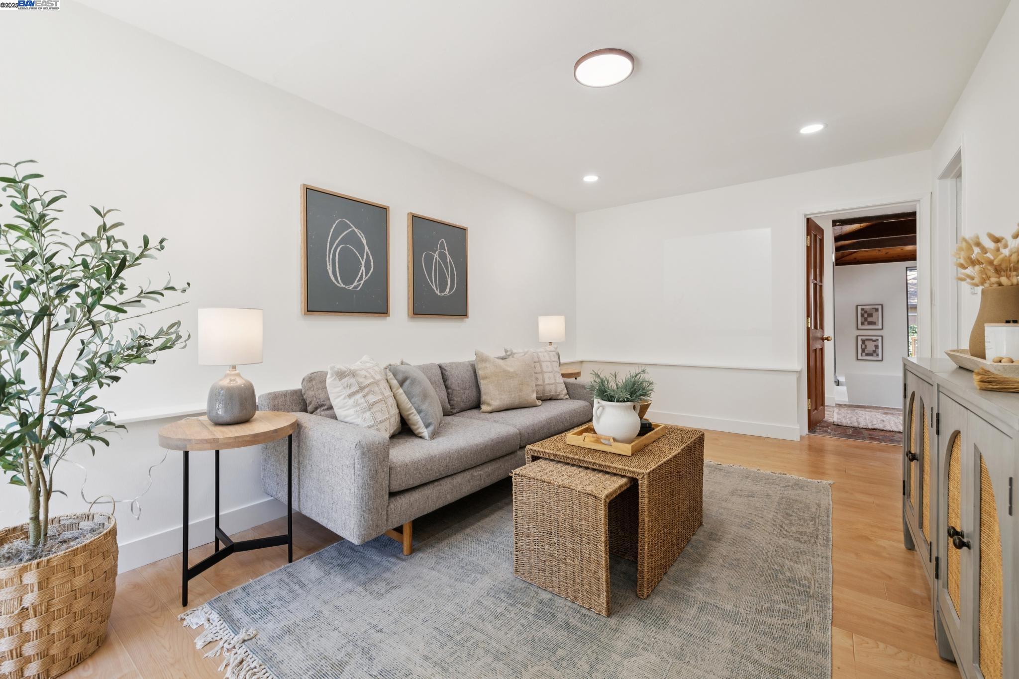 Tucked away on a private cul-de-sac, this beautifully refreshed mid-century gem offers timeless character, modern updates, and extraordinary land. Inside, you'll find a thoughtfully updated kitchen and refreshed bathrooms, along with refinished hardwood floors and fresh interior/exterior paint that enhance the home's clean, classic aesthetic. The regal great room steals the show with vaulted ceilings, exposed beams, and generous natural light--perfect for entertaining. The flexible floor plan includes 4 bedrooms, 2 bathrooms, an office nook, and an enclosed sunroom, offering space for every lifestyle. Step outside to your own private haven: a sun-drenched deck with new handrails, serene backyard, raised garden beds, and a storage shed, all framed by lush natural surroundings. Set on a sprawling 0.77-acre lot, the property features a private bridge over a tranquil creek, leading to an additional carport and second access from Moraga Way. Whether hosting or unwinding, this home offers an ideal indoor-outdoor experience. Additional highlights include a 1-car garage, proximity to top-rated Orinda schools, and a peaceful setting that feels miles away--yet moments from everything.